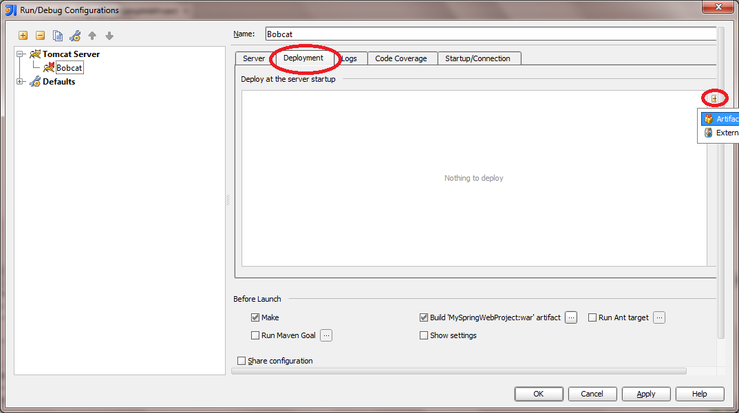 9. go to the “deployment” tab and click the “+” button to add an Artifact. Again, choose the war file