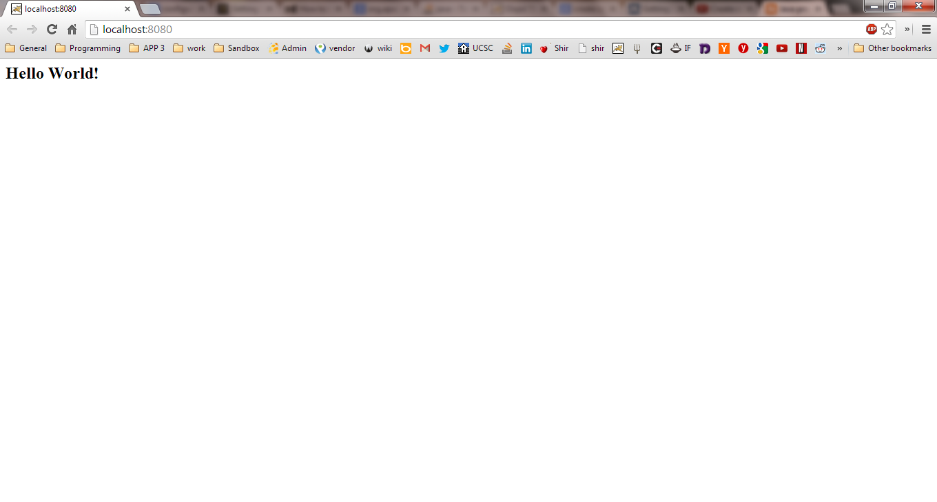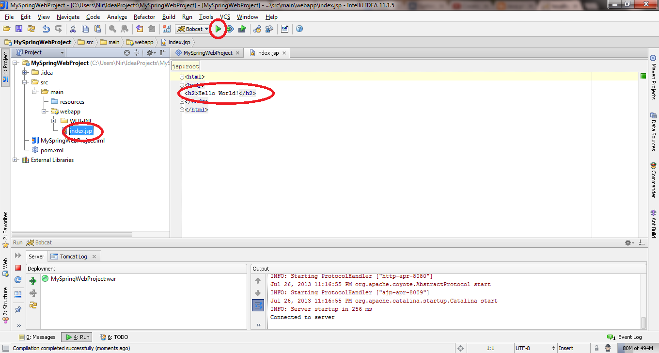 Click the green “Play” button and after Tomcat starts, you should be able to view “Hello World” jsp version on localhost