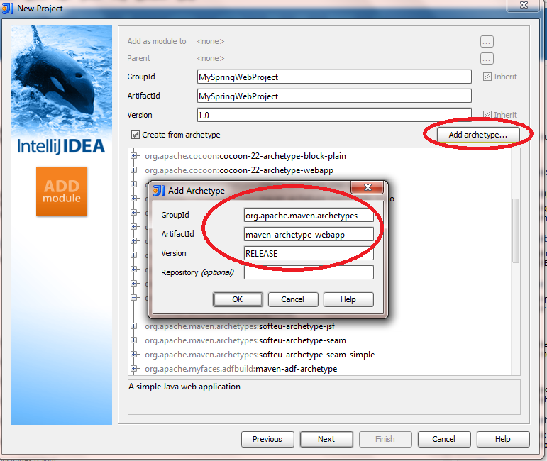 4. In case we didn’t have the archetype, we’ll click on “add archetype” and add it manually as follows: