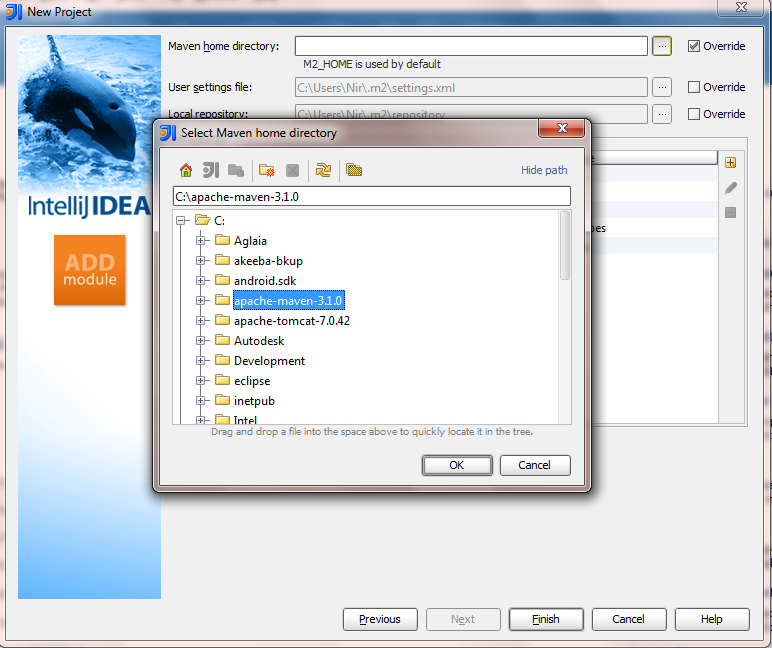2. select “Maven module” as a type and click “Next” after filling out the project name and path