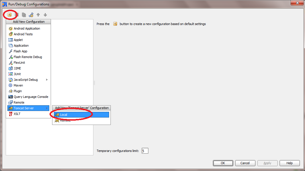 7. goto “edit configurations”, click on the “+” button and choose the local version of Tomcat