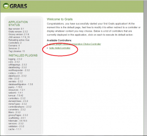 and once you’ll click the controller-link, you’ll receive a sweet “Hello World!” in Grails.